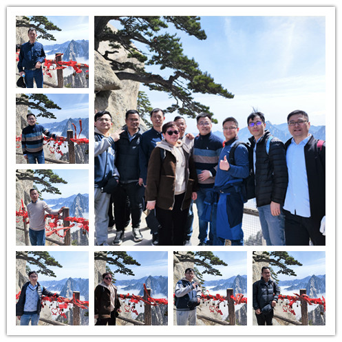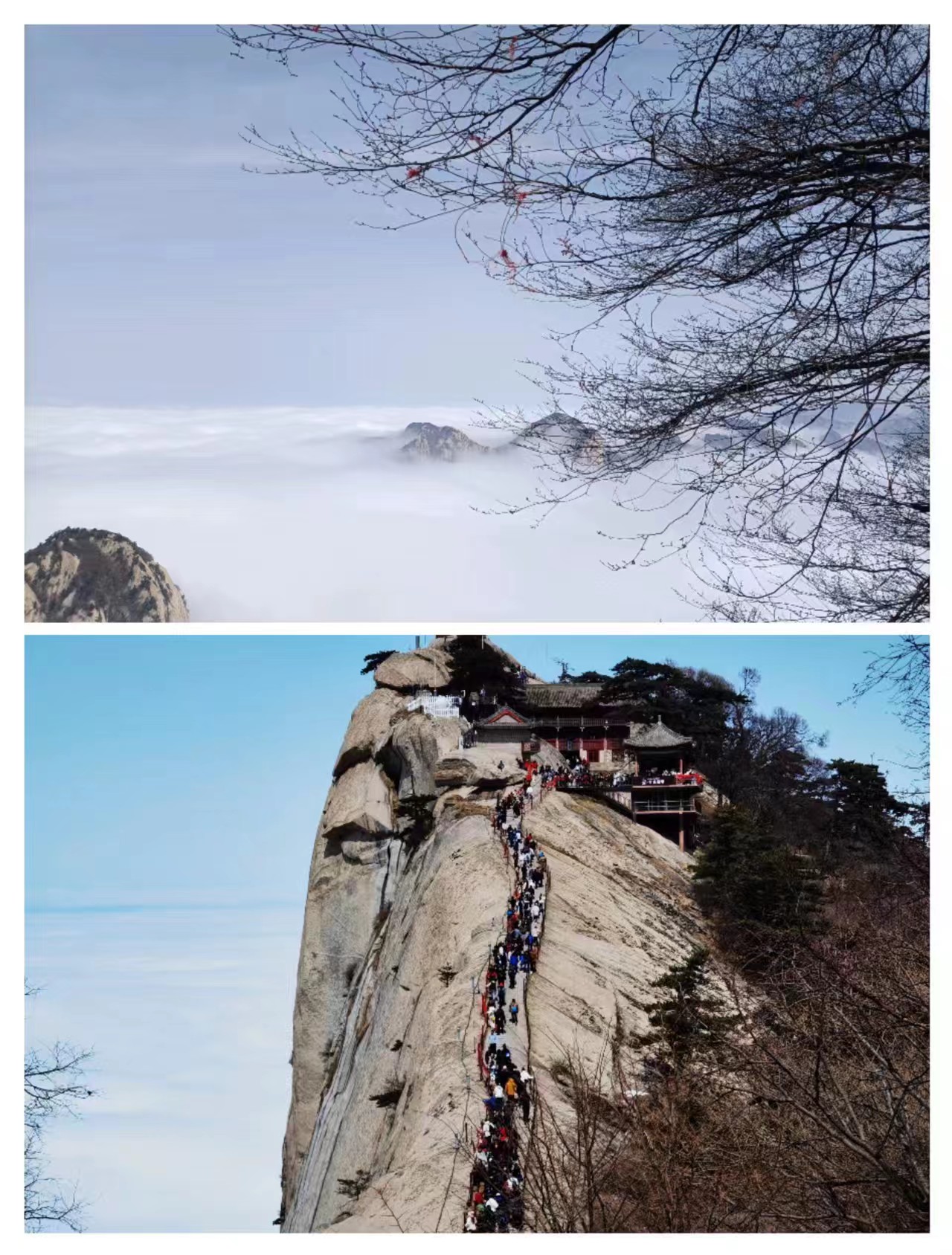 此行天气异常晴朗,山桃灼灼,却白雪皑皑。观云海之缥缈,赏五峰各异之妙,望道观之仙风道骨。秀结阴阳会,奇成造化工。青壁疑无路,瑶华别有宫。云梯联断堑,铁索下虚空。如此奇险,我们还是览遍五峰。虽登山不易,但风景尤胜,乐亦无穷也。